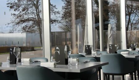 L’Atelier du Cerisier est situé au cœur du parc du Louvre-Lens : laissez-vous guider par le ballet entre salle et cuisine et contemplez le musée depuis votre table !